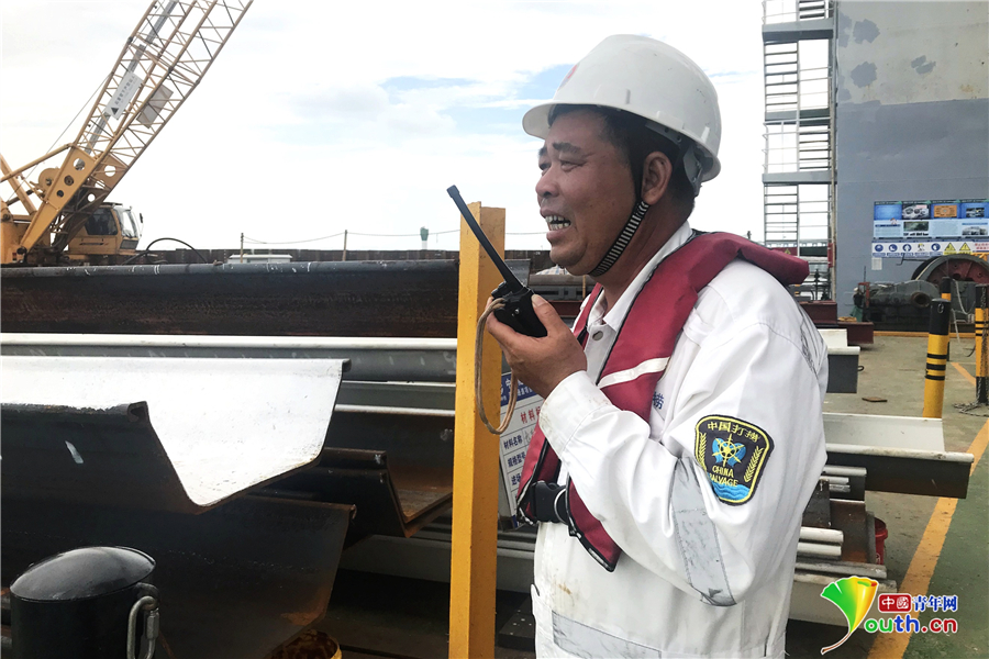 鐘海鋒正通過潛水電話指揮潛水員作業(yè)。詹欣金 攝
