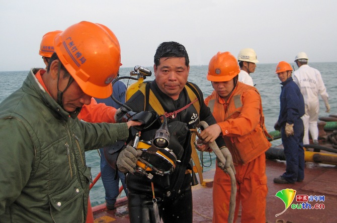 接到任務(wù),鐘海鋒立即組織廣州打撈局應(yīng)急分隊(duì)直奔出事地點(diǎn),進(jìn)行水下搜尋。11月28日下午,在經(jīng)過36個(gè)小時(shí)的連續(xù)搜尋后,一名潛水員發(fā)現(xiàn)沉船貨艙里還有6名幸存者。