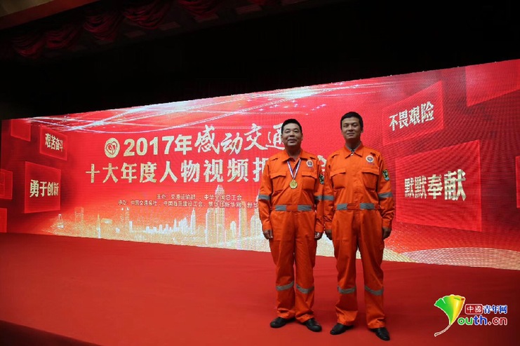 鐘海鋒(左)與鐘佛軍(右)在2017年感動(dòng)交通十大年度人物頒獎(jiǎng)現(xiàn)場(chǎng)。本人供圖