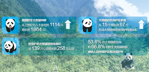 野外調(diào)查顯示,我國野生大熊貓種群從上世紀七八十年代的1114只增長到1864只,大熊貓自然保護區(qū)從15個增長到67個,形成大熊貓棲息地保護網(wǎng)絡(luò)體系。受保護的大熊貓棲息地面積從139萬公頃增長到258萬公頃,53.8%的大熊貓棲息地和66.8%的野生大熊貓種群被納入自然保護區(qū)有效保護中。