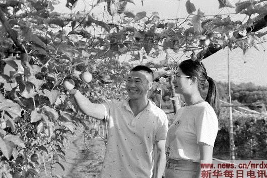 武平縣返鄉創業大學生王秀珍(右)與合作種植的果農一起查看百香果的生長情況。(本報記者郭圻攝)