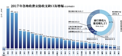 昨日(24日)上午,交通運輸部召開例行發布會,發布了《2017年全國收費公路統計公報》(以下簡稱《公報》),截至2017年底,全國收費公路債務余額52843.5億元,通行費收支缺口達4026.5億元,收費公路超八成的收入用于償還債務本金及利息。