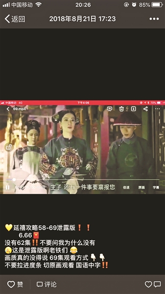 《延禧攻略》《如懿傳》等影視劇正在熱播,劇迷們的追劇熱情持續(xù)高漲,每天盼著劇集更新成為常態(tài)。以《延禧攻略》為例,截至8月23日上午,劇集已更新至56集,在部分視頻網(wǎng)站上充值成為會(huì)員后,可以觀看至64集。但近日,有不少網(wǎng)友發(fā)現(xiàn),網(wǎng)上出現(xiàn)了銷售《延禧攻略》未播劇集的商家。購買資源后,可以直接觀看至68集。