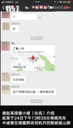 小李還于24日16時左右于永嘉上塘派出所報案,其間警方通過趙某朋友的手機與滴滴平臺溝通要求獲得司機具體信息(電話、車牌等),但無果。上塘派出所民警證實,昨天派出所內有民警參與處理該起事件。