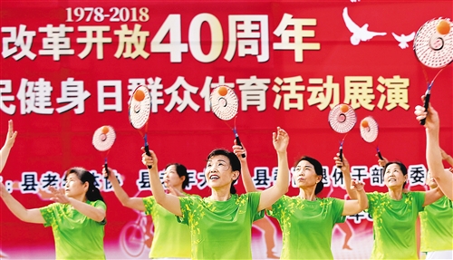 湖北省襄陽市南漳縣舉行群眾體育活動展演。上千名干部群眾分別展示了太極拳劍、健身氣功、柔力球、廣場舞等精彩節目,紀念改革開放40周年。 熊明銀攝