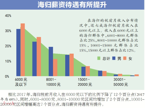 22日,某招聘網(wǎng)站與某智庫(kù)機(jī)構(gòu)聯(lián)合發(fā)布了《2018中國(guó)海歸就業(yè)創(chuàng)業(yè)調(diào)查報(bào)告》,重點(diǎn)反映了以“90后”為主的新生代海歸群體在留學(xué)前后的發(fā)展變化。與去年相比,今年調(diào)查的海歸就業(yè)競(jìng)爭(zhēng)力及薪酬均有提升,近七成海歸稅前月收入在6000元以上,月收入在10001~20000元區(qū)間的增幅達(dá)7個(gè)百分點(diǎn)。