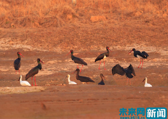 河南省孟津縣黃河濕地國家級自然保護區(qū)內的黑鸛(黃河濕地孟津管理局供圖)