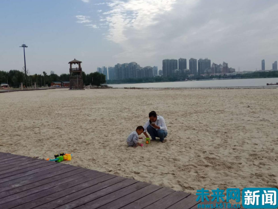 一位年輕的媽媽帶著孩子在沙灘上玩耍。未來網記者 劉文靜 攝
