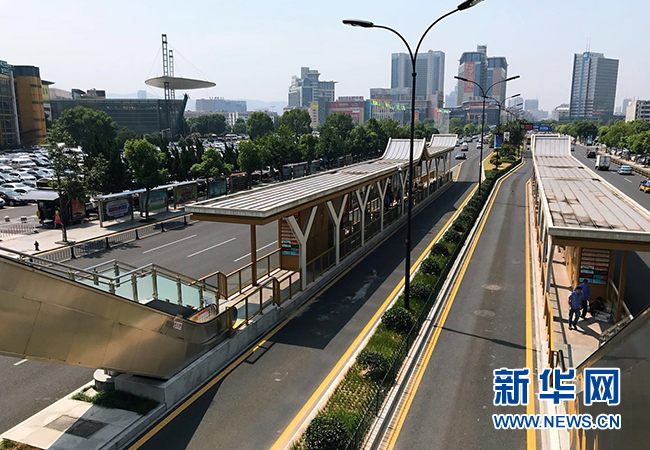 公交專用道設立在馬路中央,減少了道路兩側路口以及其他社會車輛對公交運營的影響。新華網(wǎng) 郝多 攝