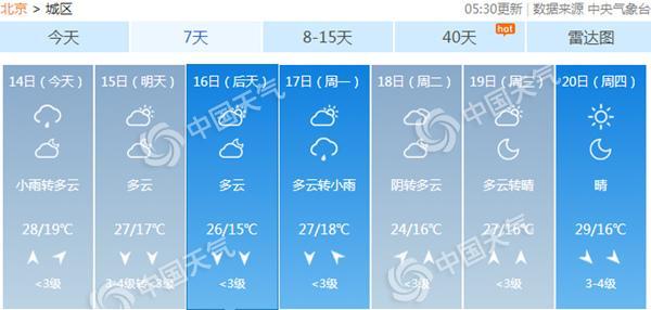 今天京城大部有小雨,北京市氣象臺(tái)預(yù)計(jì),今天白天陰大部地區(qū)有小雨或零星小雨轉(zhuǎn)多云,早晨有輕霧或霧,北轉(zhuǎn)南風(fēng)二三級,最高氣溫28℃;夜間多云轉(zhuǎn)陰,北部山區(qū)有小雨,南風(fēng)二級轉(zhuǎn)北風(fēng)三四級,最低氣溫19℃。
