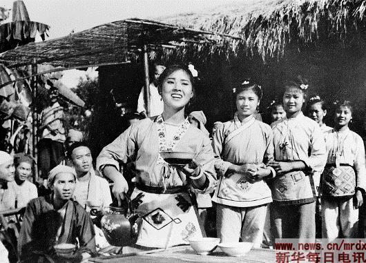 影片《劉三姐》中的一個鏡頭:劉三姐(前,黃婉秋飾)和四方歌手會歌。新華社資料片