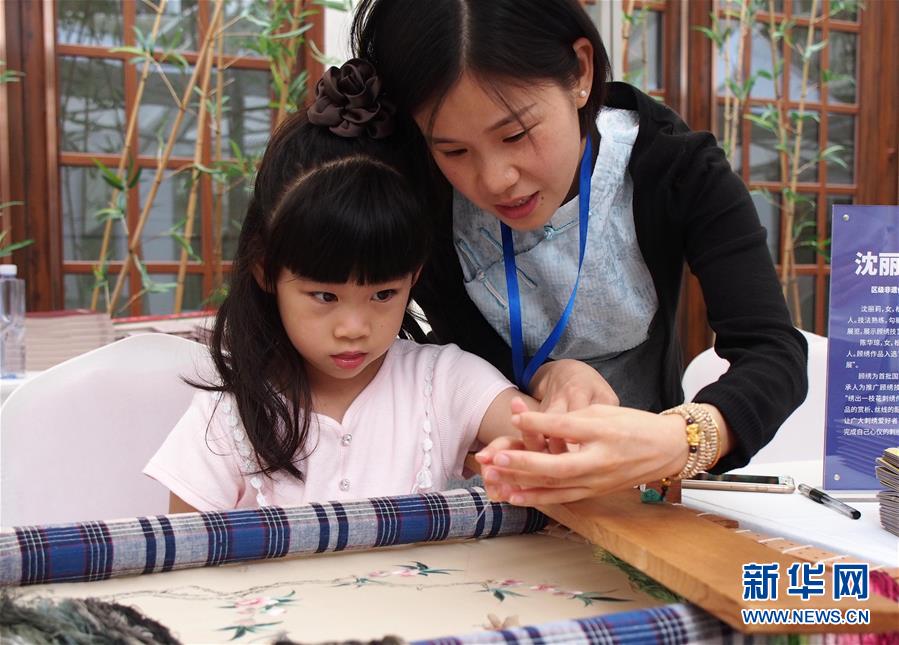 一位小女孩體驗(yàn)國家級(jí)非物質(zhì)文化遺產(chǎn)“顧繡”針法