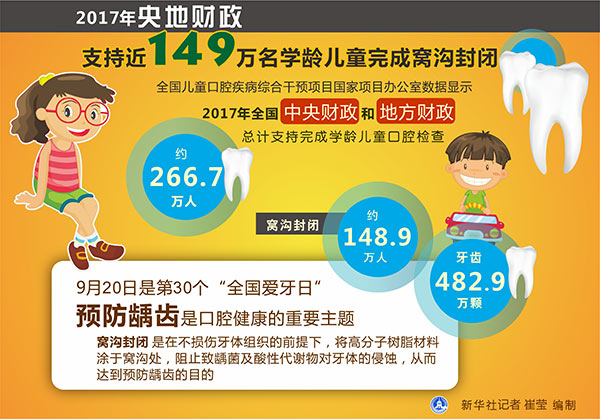 新華社北京9月18日電(記者陳聰)記者從全國兒童口腔疾病綜合干預項目國家項目辦公室了解到,2017年在中央和地方財政支持下,共有約149萬名7-9歲兒童從窩溝封閉項目服務中獲益,這些兒童齲齒發(fā)生得到了有效預防。