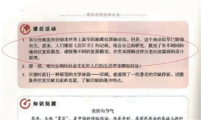 “通過這些要求旨在引導(dǎo)學(xué)生以實(shí)踐探索的方式,更好地了解張衡及地動(dòng)儀的相關(guān)知識,體會(huì)中國古人的智慧,增強(qiáng)民族自豪感,提升學(xué)生綜合素質(zhì)。”人教社稱。