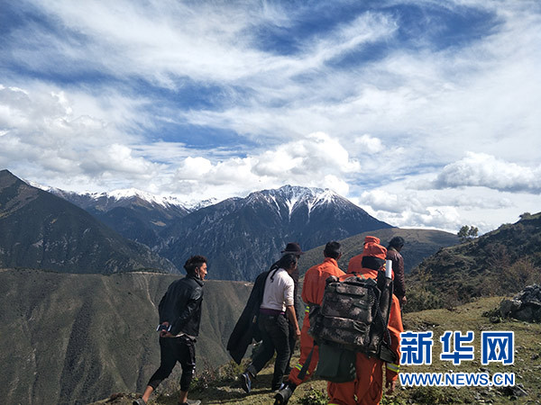 先遣隊(duì)員在波公村勘察地質(zhì)災(zāi)害情況(10月13日攝)。 新華社發(fā)(夏能 攝)