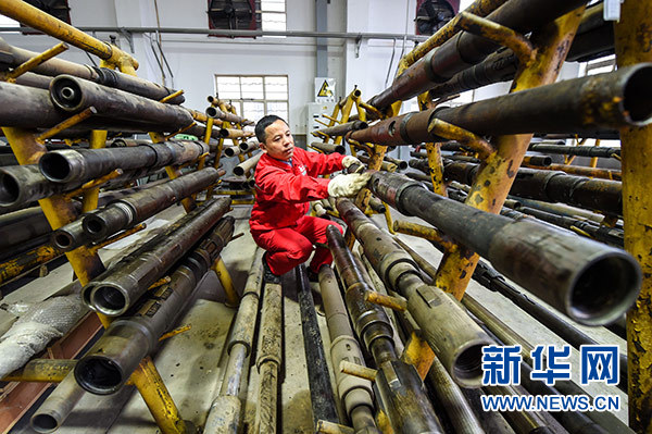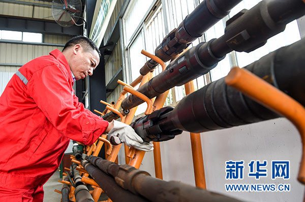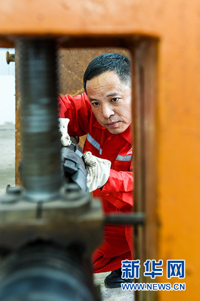 在中國(guó)石化江蘇油田工程技術(shù)服務(wù)中心,田明在檢查設(shè)備(10月9日攝)。新華社記者 李博 攝