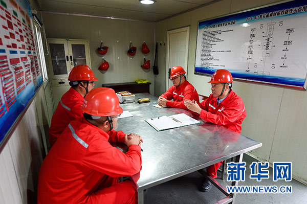 田明(右一)與團(tuán)隊(duì)工作人員在江蘇真武油田井場(chǎng)研究設(shè)備作業(yè)運(yùn)轉(zhuǎn)情況(10月9日攝)。新華社記者 李博 攝