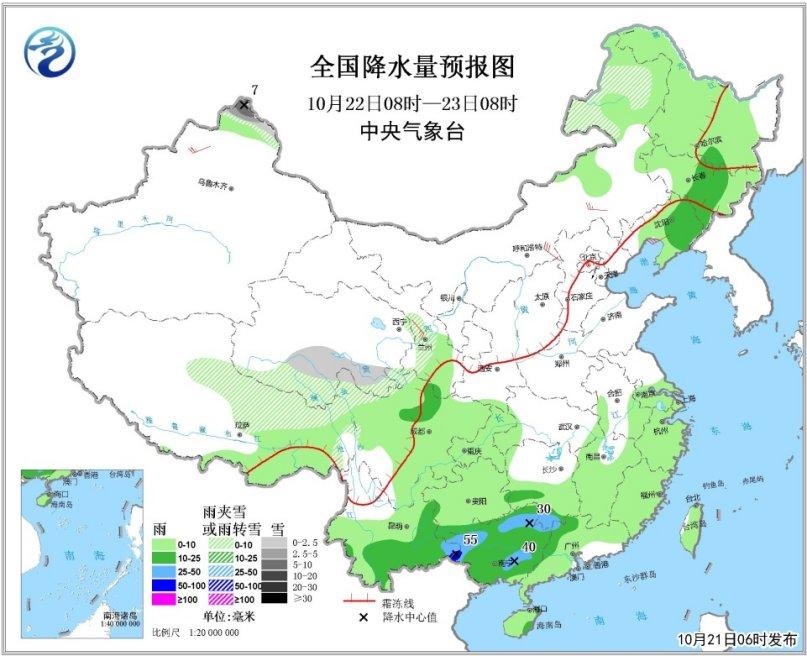 10月21日08時至22日08時,新疆塔城和阿勒泰地區、內蒙古東部、青海南部、西藏東部、川西高原北部等地的部分地區有小到中雪或雨夾雪,其中阿勒泰北部局地有大雪。江南中西部、華南西部和北部、海南島中東部等地有中到大雨,其中廣西中部和南部沿海、海南島東南部等地的局部地區有暴雨(50~70毫米)。內蒙古西部、甘肅中部有4~5級偏北風(見圖1)。
