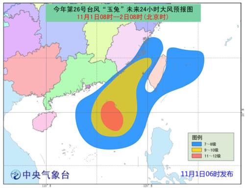 受“玉兔”和冷空氣共同影響,11月 1日08時到11月2日08時,廣東東部、福建中南部沿海、臺灣東部和南部等地將有大雨,局地有暴雨或大暴雨(50~110毫米)。東海南部偏南海域、臺灣以東洋面、巴士海峽、南海中東部偏北海域和南海西北部偏東海域及臺灣沿海將有7~8級大風(fēng),陣風(fēng)9~10級;臺灣海峽、福建沿海、廣東東部沿海、南海東北部大部海域風(fēng)力達9~10級,陣風(fēng)11~12級;“玉兔”中心經(jīng)過的南海東北部的部分海域或地區(qū)的風(fēng)力可達11~12級,陣風(fēng)13~14級(見圖2)。