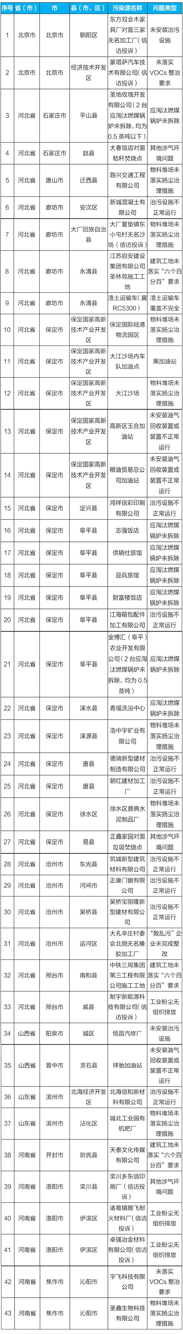 據(jù)生態(tài)環(huán)境部微信公眾號消息,11月9日,2018-2019年藍天保衛(wèi)戰(zhàn)重點區(qū)域強化監(jiān)督工作繼續(xù)開展,發(fā)現(xiàn)涉氣環(huán)境問題45個(其中2家企業(yè)各有2臺應(yīng)淘汰燃煤鍋爐未拆除),如下: