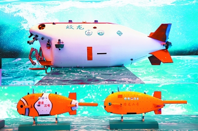 “可上九天攬月,可下五洋捉鱉”。一邊是航天技術展區,一邊是航海技術展區,完美對應著詩句,一上一下,延展著人類對于世界的認知和想象。天宮二號空間實驗室、嫦娥三號月球探測器以及蛟龍、海龍、潛龍“三龍兄弟”深海探測裝備模型,讓很多在場的孩子發出贊嘆之聲。