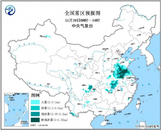 中央氣象臺11月19日08時發布大霧黃色預警: