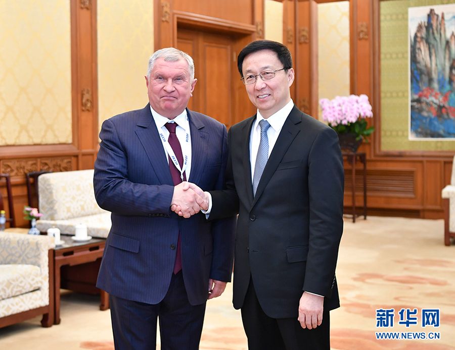 11月29日,中共中央政治局常委、國務院副總理韓正在北京釣魚臺國賓館會見來華出席中俄能源商務論壇的俄羅斯聯邦總統能源發展戰略和生態安全委員會執行秘書、俄羅斯石油公司總裁謝欽。新華社記者 殷博古 攝