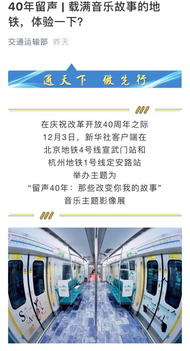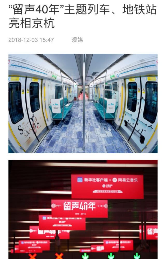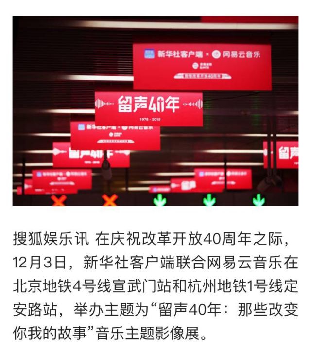 新華社北京12月4日電(記者 牧小湘)為慶祝改革開放40周年,新華社客戶端與網易云音樂、京港地鐵聯合舉辦的“留聲40年:那些改變你我的故事”音樂主題影像展12月3日亮相北京地鐵4號線宣武門站及杭州地鐵1號線定安路站。