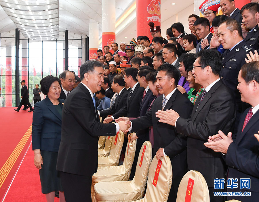 南寧荔園山莊會(huì)見廳內(nèi),圍欄上懸掛著鮮艷的紅綢帶,印有廣西壯族自治區(qū)成立60周年慶?;顒?dòng)徽標(biāo)的立柱高高聳立,簡樸莊重的大廳洋溢著喜慶祥和的氣氛。汪洋等走上前去與大家親切握手,并代表中央代表團(tuán)向他們表示問候。