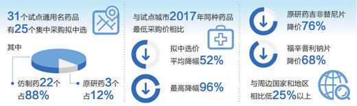 擬中選結果顯示,31個試點通用名藥品有25個集中采購擬中選,成功率81%。其中,通過一致性評價的仿制藥22個,占88%,原研藥3個,占12%。與試點城市去年同種藥品最低采購價相比,擬中選價平均降幅52%,最高降幅96%。原研藥吉非替尼片降價76%,福辛普利鈉片降價68%,與周邊國家和地區相比低25%以上。