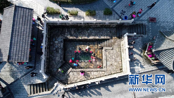 人們?cè)诮饕舜簻販?zhèn)的溫泉泉眼邊打水(2月28日無人機(jī)拍攝)。? 新華社記者 彭昭之 攝