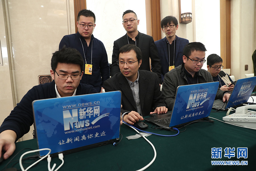 全國政協十三屆一次會議新聞發布會3月2日16:30在人民大會堂一層新聞發布廳召開,大會新聞發言人王國慶向中外媒體介紹本次大會有關情況并回答記者提問。圖為發布會前新華網直播團隊進行準備工作。新華網/中國政府網 翟子赫攝
