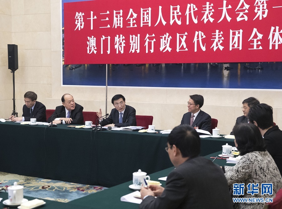 王滬寧分別參加了香港代表團、澳門代表團審議。王滬寧在與香港、澳門地區全國人大代表親切交流時表示,中共十八大以來,在以習近平同志為核心的中共中央領導下,國家發展取得歷史性成就,“一國兩制”實踐取得新的進展。要落實中共十九大對港澳工作重大部署,認真貫徹落實習近平總書記關于做好港澳工作的重要指示精神,全面準確貫徹“一國兩制”方針,嚴格按照憲法和基本法辦事,支持特別行政區政府和行政長官依法施政、積極作為,支持港澳融入國家發展大局,增強港澳同胞的國家意識和愛國精神,更好維護港澳繁榮穩定。港澳地區全國人大代表要增強大局意識、責任意識,發揮好作為愛國愛港、愛國愛澳中堅力量的作用。