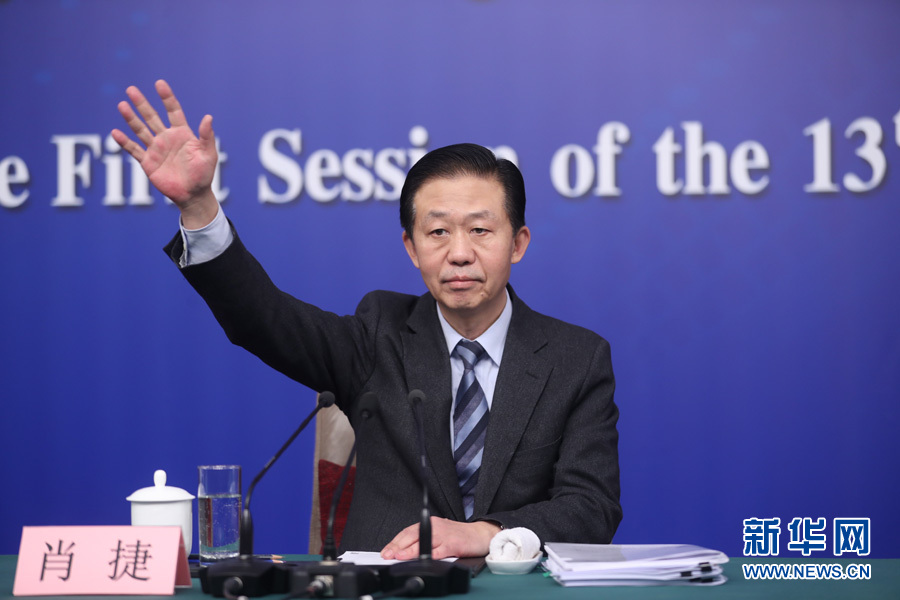 十三屆全國人大一次會議新聞中心于3月7日上午在梅地亞中心多功能廳舉行記者會,邀請財政部部長肖捷,副部長史耀斌、胡靜林就“財稅改革和財政工作”相關(guān)問題回答中外記者提問。圖為財政部部長肖捷向記者舉手示意。新華網(wǎng)/中國政府網(wǎng) 翟子赫 攝
