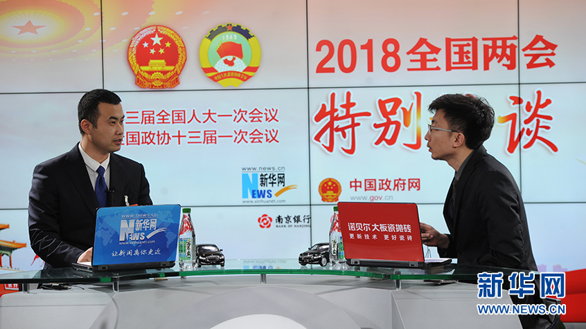 3月9日,全國人大代表、遼寧三溝酒業有限責任公司董事長吳京耕(左)做客新華網2018全國兩會特別訪談。新華網?郭小天攝