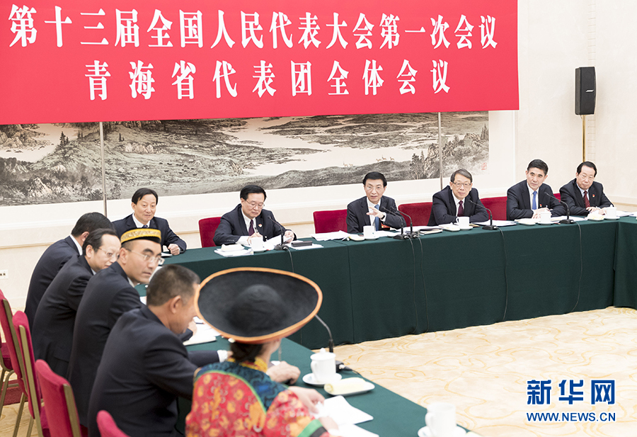 3月12日,中共中央政治局常委、中央書記處書記王滬寧參加十三屆全國人大一次會議青海代表團的審議。