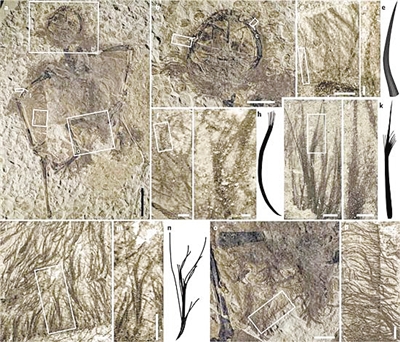 姜寶玉的團隊在翼龍身體上共發現了4種毛發,它們結構各不相同。第一種是中空的單絲狀毛發,類似“頭發”,分布在幾乎全身各部位;第二種是刷子狀的,根部是一個長軸,頂端有許多輻射狀的分岔,大多分布在頸部、前肢近端、腳掌和尾巴近端的部分;第三種比較直,有個明顯的主軸,但在中段有些小分岔,分布在頜部;最后一種是從根部就開始分岔,呈絨毛狀,分布在翅膀位置。這4種結構的毛發之前只發現于恐龍的兩個主要類群——植食性的鳥臀類(Ornithischians)和獸腳類(Theropods)(其中一支演化成為鳥類)。楊子瀟說:“借助高倍顯微鏡仔細觀察化石的各個角落,我們發現所有4種毛發在翼龍身上都保存了可觀的數量。”這一發現改變了人們對翼龍只有單一毛發的刻板印象。