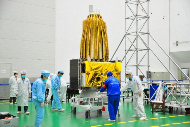 發射前的鵲橋號中繼衛星。(中國航天科技集團五院供圖)