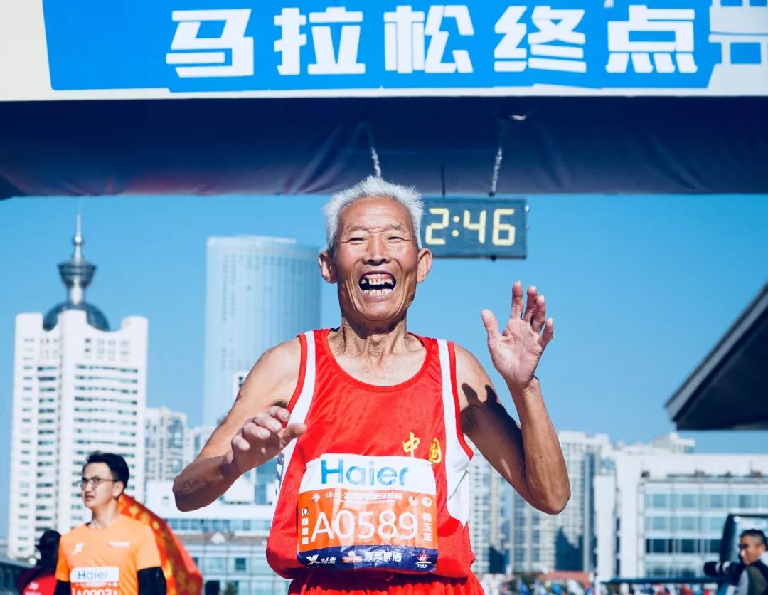 2018-10-28,青島。一名白發老人完成馬拉松后很開心。作者:feng