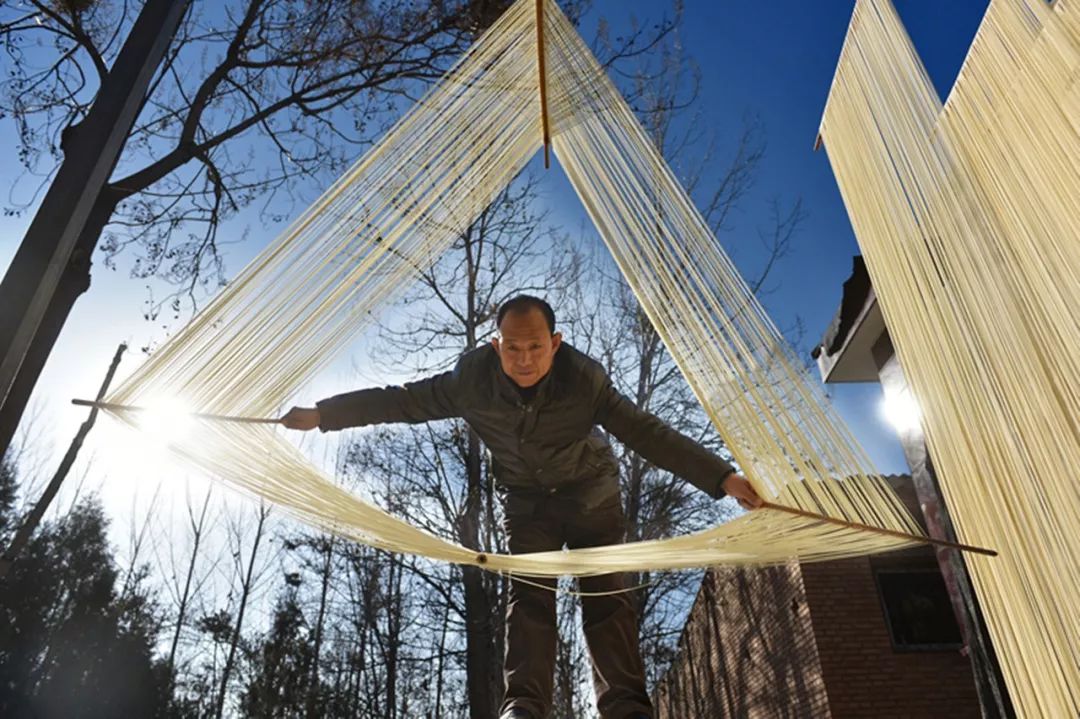 2018-12-13,河南靈寶。川口鄉閆謝村李潤澤正在自家院子里制作掛面。作者:紫色光