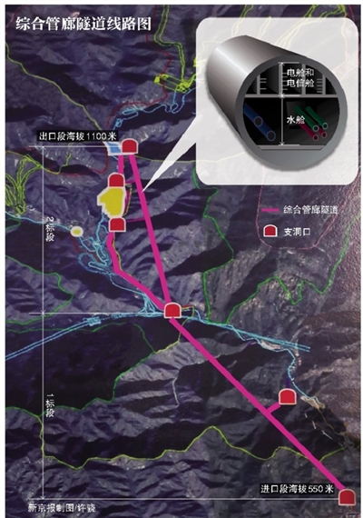 怎樣把對生態(tài)環(huán)境的影響降到最低是施工隊面臨的另一項考驗。在施工方案的選擇上,設計團隊曾想過另外一種建設方案,但最終被否定。“最初的方案是在山坡上做溝渠,從山下把水運送到山上,但這種方法只能用來運水,而且要砍伐大量樹木,生態(tài)破壞嚴重。” 韓寶江說,采用地下綜合管廊的建設方式,不但可以同時輸送電力和水,而且伐樹少,占地面積小,能夠最大程度保護山體生態(tài)環(huán)境。為減少對野生動物生活習性的影響,施工隊在爆破時也盡可能在白天進行。