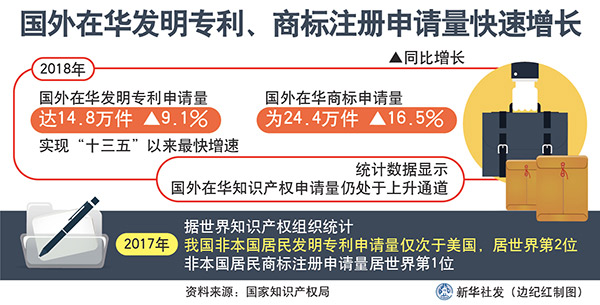 2018年,國外在華發(fā)明專利申請(qǐng)量達(dá)14.8萬件,國外在華商標(biāo)申請(qǐng)量為24.4萬件,分別同比增長9.1%、16.5%,其中,前者實(shí)現(xiàn)“十三五”以來最快增速。統(tǒng)計(jì)數(shù)據(jù)顯示,國外在華知識(shí)產(chǎn)權(quán)申請(qǐng)量仍處于上升通道。