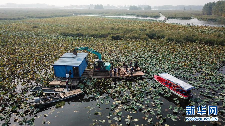 安新縣水產(chǎn)養(yǎng)殖戶在白洋淀清除漁場(chǎng)設(shè)施(2018年10月5日攝)。新華網(wǎng)發(fā)(張斌 攝)