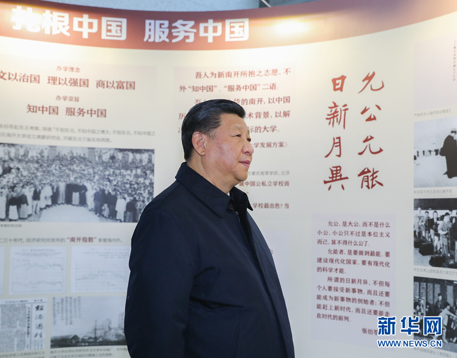 17日上午,習(xí)近平來(lái)到天津南開(kāi)大學(xué)考察調(diào)研。南開(kāi)大學(xué)成立于1919年,是一所具有光榮愛(ài)國(guó)傳統(tǒng)的名校。習(xí)近平參觀(guān)了校史展覽,詳細(xì)了解南開(kāi)大學(xué)歷史沿革、學(xué)科建設(shè)、人才隊(duì)伍、科研創(chuàng)新等情況。習(xí)近平指出,學(xué)校是立德樹(shù)人的地方。愛(ài)國(guó)主義是中華民族的民族心、民族魂,培養(yǎng)社會(huì)主義建設(shè)者和接班人,首先要培養(yǎng)學(xué)生的愛(ài)國(guó)情懷。高校黨組織要把抓好學(xué)校黨建工作和思想政治工作作為辦學(xué)治校的基本功。習(xí)近平同在現(xiàn)場(chǎng)的部分院士、專(zhuān)家及中青年教師代表進(jìn)行了交流。他指出,專(zhuān)家型教師隊(duì)伍是大學(xué)的核心競(jìng)爭(zhēng)力。要把建設(shè)政治素質(zhì)過(guò)硬、業(yè)務(wù)能力精湛、育人水平高超的高素質(zhì)教師隊(duì)伍作為大學(xué)建設(shè)的基礎(chǔ)性工作,始終抓緊抓好。在元素有機(jī)化學(xué)國(guó)家重點(diǎn)實(shí)驗(yàn)室,他強(qiáng)調(diào),要加快一流大學(xué)和一流學(xué)科建設(shè),加強(qiáng)基礎(chǔ)研究,力爭(zhēng)在原始創(chuàng)新和自主創(chuàng)新上出更多成果,勇攀世界科技高峰。他勉勵(lì)師生們把學(xué)習(xí)奮斗的具體目標(biāo)同民族復(fù)興的偉大目標(biāo)結(jié)合起來(lái),把小我融入大我,立志作出我們這一代人的歷史貢獻(xiàn)。走出實(shí)驗(yàn)室,廣場(chǎng)上擠滿(mǎn)了學(xué)生,大家高呼“總書(shū)記好”、“總書(shū)記辛苦”,齊聲高喊“愛(ài)我中華、振興中華”,還唱起《我和我的祖國(guó)》。習(xí)近平同近處的同學(xué)親切握手,向遠(yuǎn)處的同學(xué)們招手致意。掌聲、歌聲、歡呼聲在校園里久久回蕩。