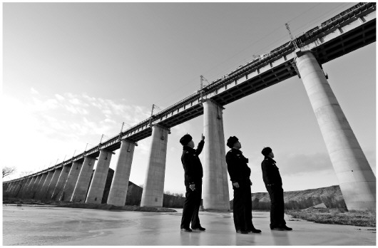 圖① 冬季瑟爾基河冰封,橋下經常有人穿行。為防止橋上石砟因火車經過震動落下砸到人,民警經常踏冰巡視。