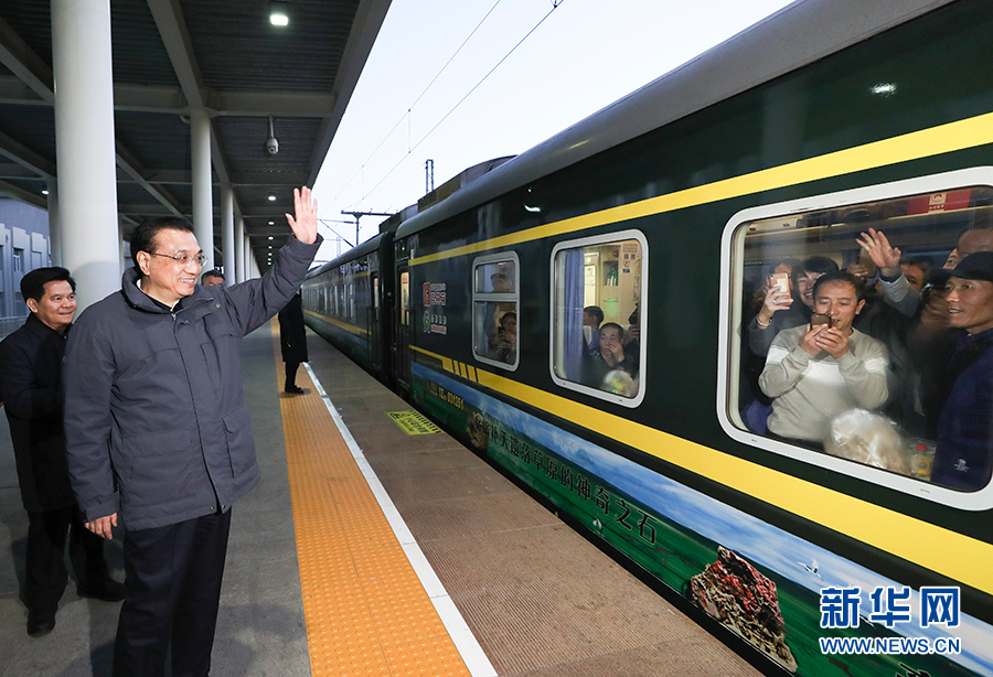 2月1日至2日,中共中央政治局常委、國務院總理李克強在內蒙古自治區烏蘭察布市考察。這是2月1日,李克強來到集寧南火車站,登上包頭開往大連的K1567次列車,看望慰問返鄉旅客。列車開動時,李克強在站臺上與旅客相互揮手道別。 新華社記者 姚大偉 攝