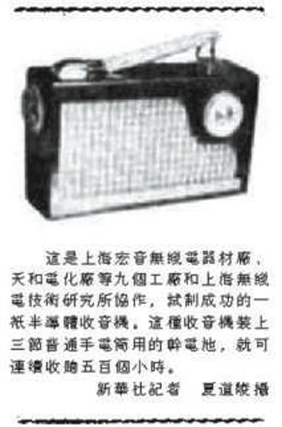 ??? 編者按: 1958年3月13日,人民日報報道我國第一臺半導(dǎo)體收音機在上海誕生。