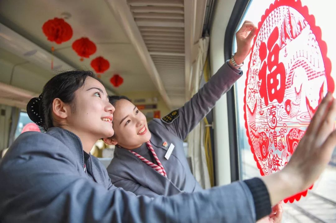 2019-01-29,江西省南昌市。南昌至北京西的Z68次列車上,乘務員在車上貼上窗花,為旅客準備免費書籍、玩具和春節物品等,營造濃濃的年味兒。作者:清風吹過60年
