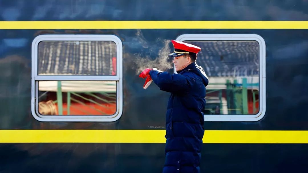2019-01-31,吉林省白山市江源站。鐵路工作人員在發車前核對時間的瞬間。作者:了凡大叔
