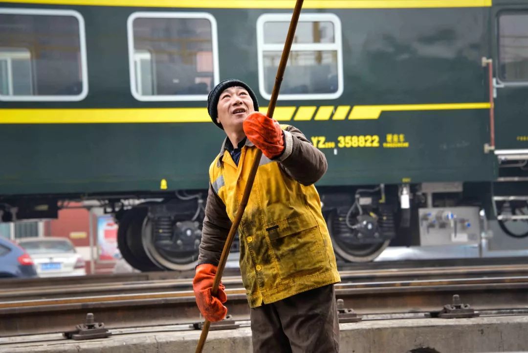 2019-02-01,河南鄭州火車站。“錘叔”鄭獻敏是鄭州車輛段的職工,38年來,他忙碌于站臺上,穿梭于股道間,用一把小小的檢車錘確保著南來北往的旅客的乘車安全。作者:趙慶